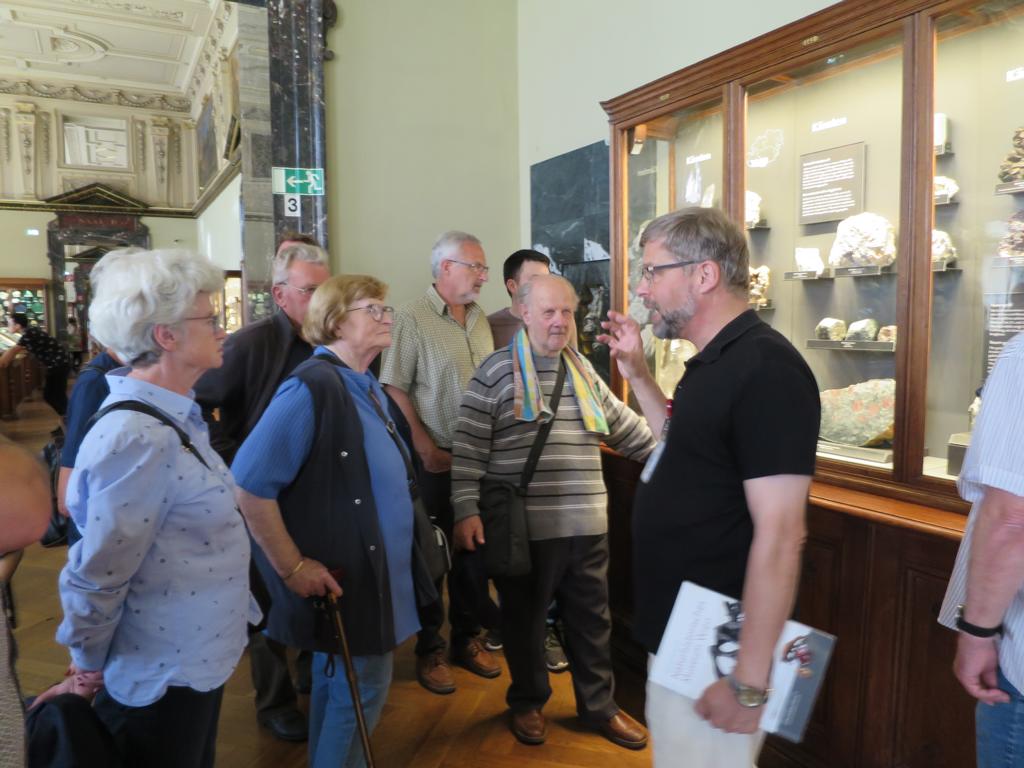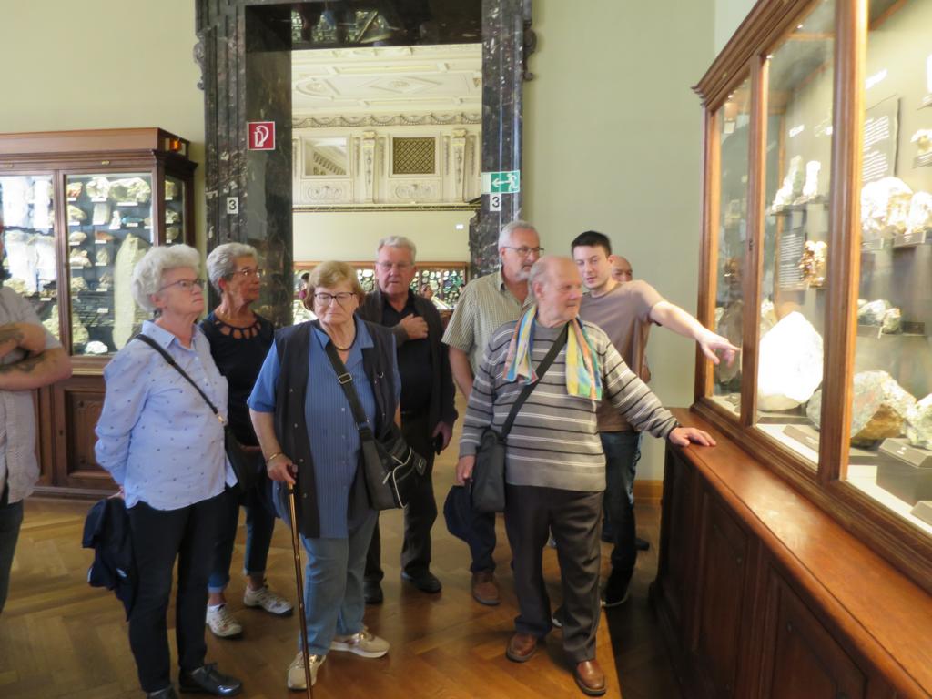 16 Reiseteilnehmer waren pünktlich um 7:00 Uhr zur Abfahrt nach Wien bereit. Unser Fahrer, ein Wien Kenner, fuhr uns stressfrei zum Museum, wir kamen gegen 9:40 Uhr an. Beindruckend ist das dem NHM gegenüberstehende Gebäude des Kunsthistorischen Museums, das von 1871 bis 1881 erbaut wurde. Unser Ziel war die Mineraliensammlung des naturhistorischen Museums. In vier Sälen untergebracht sind ca. 40000 Mineralien, das sind etwa 15% der gesamten Sammlung zum Teil aus den ehemaligen Kronländern der Österreichisch – Ungarischen Monarchie. Die gut einstündige Führung führte uns punktuell durch die Sammlung und zeigte in groben Zügen die Höhepunkte, zum Beispiel die ca. 1 m2 große Salzstufe mit 10-15 cm großen Kristallen. Phantastisch ist natürlich auch der aus hunderten Edelsteinen sogenannte Blumenstrauß. Anschließend trennte sich die Gruppe, einige gingen in das sehr schöne Kaffee, Andere in den Paläontologischen Teil, die Spezialisten blieben bei den Mineralien. Um alles zu sehen, würde man sicher Tage brauchen. Das NHM war sehr gut besucht, denn vor dem Eingang stand eine wahrscheinlich 100 Meter Menschenschlange, die auf Einlass wartete. Um ungefähr 13:00 Uhr waren die letzten Reiseteilnehmer auf dem Weg zum vereinbarten Treffpunkt, der Bus kam punktgenau und wir fuhren weiter in die Wachau nach St. Michael, unser Kollege Helmut blieb jedoch in Wien. Im Gasthaus Weinschänke wurden wir herzlich empfangen und von einem freundlichen und kompetenten Team bedient. Das Essen war sehr gut und ausreichend und ein paar Achterl guten Wachauer Weines hielten die Stimmung hoch. Gut gestärkt und rundherum zufrieden verließen wir um 17:15 Uhr das Lokal und fuhren über Melk zurück nach Hause, wo wir um 18:50 ankamen. Wir waren uns Alle einig,das dies ein sehr gelungener Ausflug war.